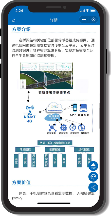中国电信天翼物联在桥梁结构关键部位部署传感器组成传感网,通过物联网,将监测数据实时传输至云平台,云平台则对监测数据进行多种智能算法分析,实现对桥梁运行生命周期的监测和管理。而客户可通过管理平台、手机APP随时登陆查看监测数据。