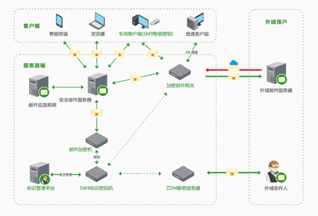 方案以SM9标识密码算法为核心,综合使用SM3、SM4国密算法,遵循国家电子邮件相关邮件安全标准,符合公安部等保三级要求,对电子邮件增强身份认证、对传输和存储进行加密,实现电子邮件系统全方位安全保护。