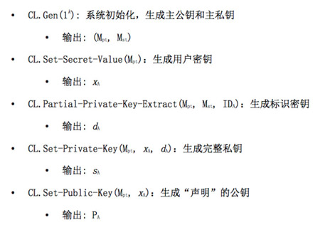 Al-Riyami和Paterson在2001年提出无证书的密码体制后引起广泛的关注。学术界进行了大量的安全模型理论研究并构造了一系列包括无证书加密算法、签名算法和密钥交换协议等安全机制。遗憾的是,由于Al-Riyami和Paterson对CL-PKC中密钥生成算法的定义方法导致这类模型无法覆盖隐式证书系统,生成的密钥对难以结合标准的如ECC密码算法使用。一些基于标准算法的无证书签名算法构造都被证明不能满足 Al-Riyami和Paterson的安全模型。下面简单描述AP-CL-PKC中的密钥生成方法(CL-KGA),并分析其局限性。AP-CL-PKC由以下五个函数构成: