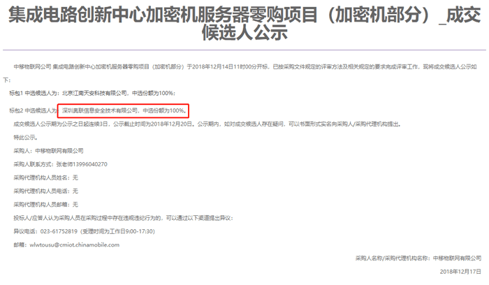 2018年12月17日传来好消息,奥联中标中国移动物联网公司集成电路创新中心加密机项目。本次中标,奥联在SM9技术的专业性,得到了中国移动的认可。在项目应用上,中国移动将采用奥联标识密码技术设备和系统实现物联网设备标识密钥的生成,管理,在云端支持基于SM9算法的各类密码运算服务。